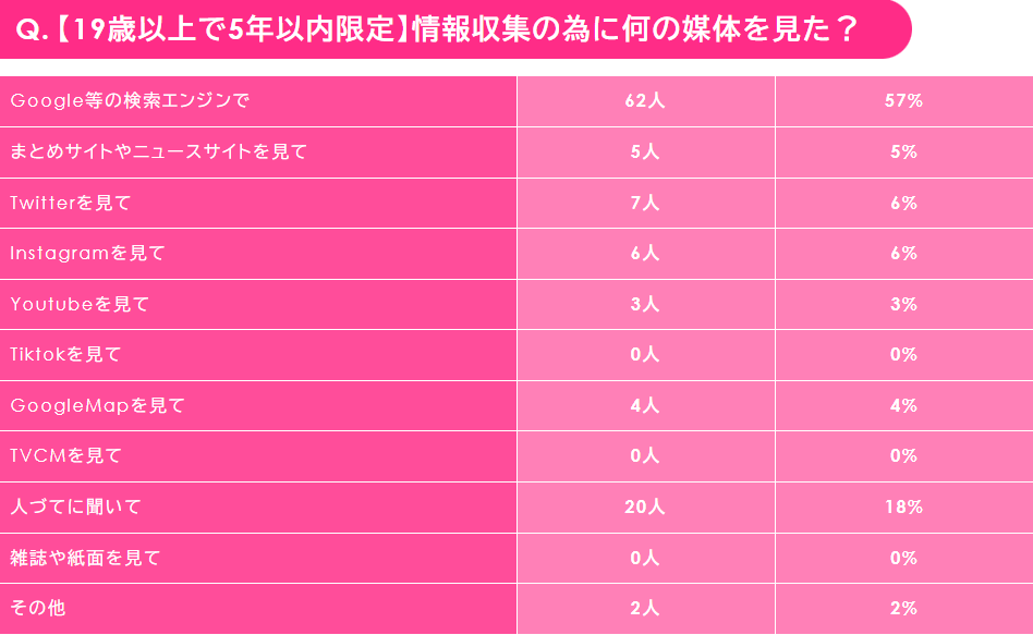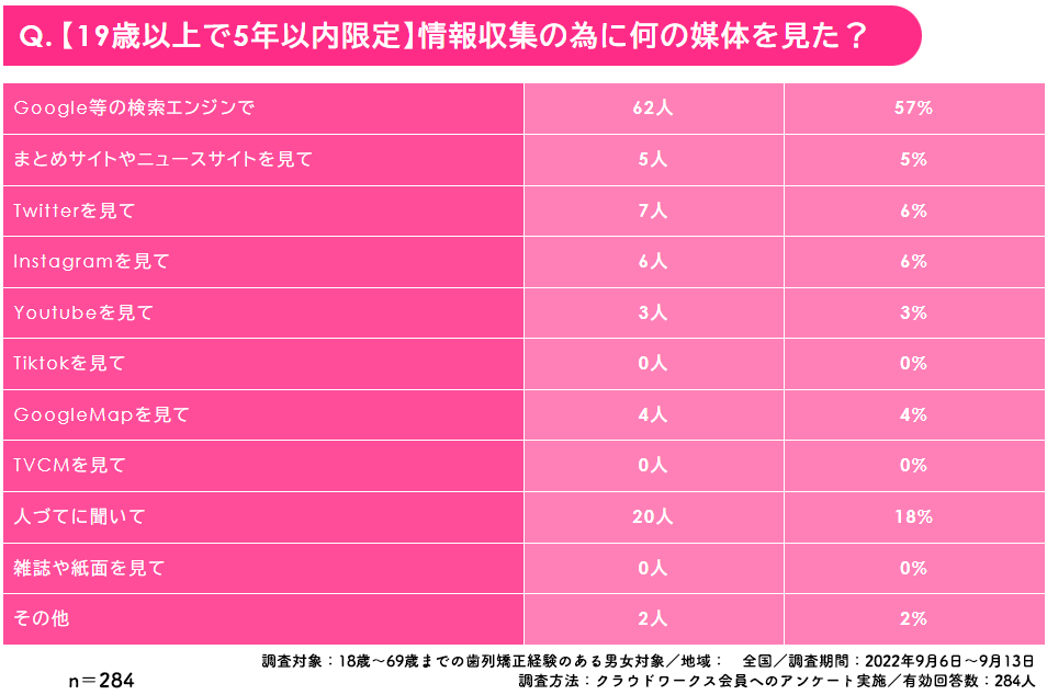 ・成人矯正の57%はGoogle検索で情報調査。SNSは少なめ。