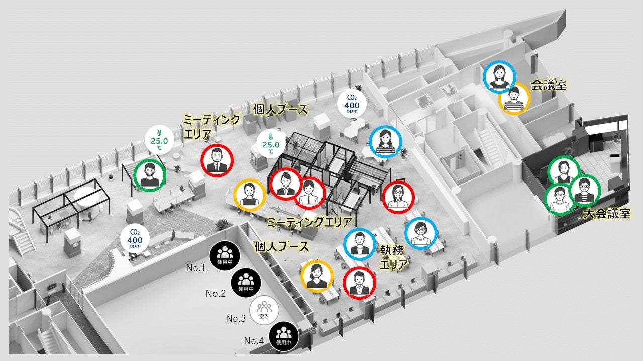 空間環境センシングにより、ワーカーの在席有無、座席や会議室などの混雑状況をリアルタイムでデータを一元