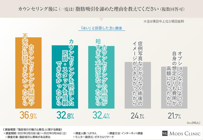 先ほどの質問「クリニックでのカウンセリングを受けた後、一度は脂肪吸引を諦めた経験がありますか?」で『はい』と回答した方に、「カウンセリング後に(一度は)脂肪吸引を諦めた理由を教えてください(複数回答可)」と質問したところ、『カウンセリングで疑問や不安が払拭できなかったから(36.9%)』が最多の結果に。以降、『カウンセリングを担当した医師・スタッフを信頼できなかったから(32.8%)』『カウセリングの時間が短すぎて不安になったから(32.4%)』『症例写真などが少なく術後のイメージができなかったから(24.1%)』『オプションなどによって自身の想定よりも費用が高額になったから(21.7%)』など、“カウンセリングの質”に関する回答に票が集まりました。