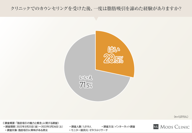「クリニックでのカウンセリングを受けた後、一度は脂肪吸引を諦めた経験がありますか?」と質問したところ、『はい(28.5%)』『いいえ(71.5%)』という結果に。