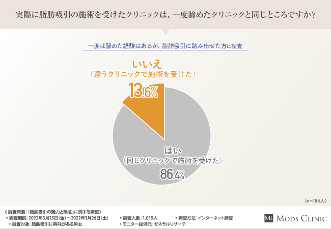 「実際に脂肪吸引の施術を受けた経験はありますか(脂肪吸引に踏み出せましたか)?」という質問に対して『はい(踏み出せた)』と回答し、また、「クリニックでのカウンセリングを受けた後、一度は脂肪吸引を諦めた経験がありますか?」という質問に対して『はい』と回答した方に向けて、「実際に脂肪吸引の施術を受けたクリニックは、一度諦めたクリニックと同じところですか?」と質問しました。