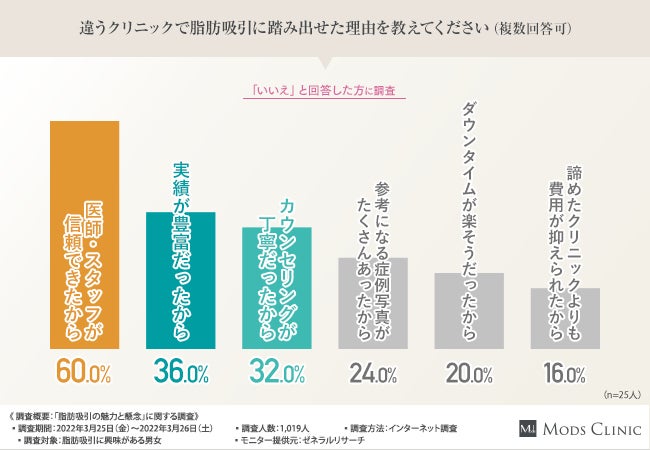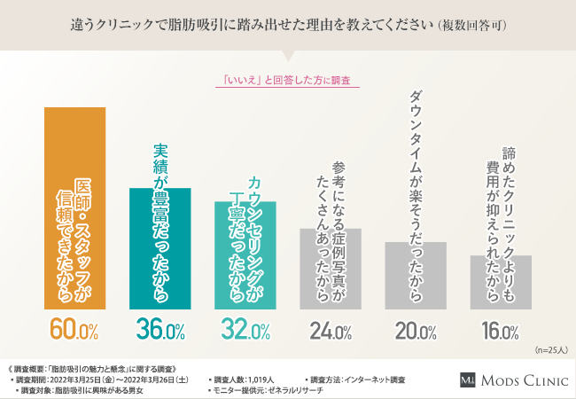 先ほどの質問「実際に脂肪吸引の施術を受けたクリニックは、一度諦めたクリニックと同じところですか?」で『いいえ(違うクリニックで施術を受けた)』と回答した方に、「違うクリニックで脂肪吸引に踏み出せた理由を教えてください(複数回答可)」と質問したところ、『医師・スタッフが信頼できたから(60.0%)』が最多の結果に。以降、『実績が豊富だったから(36.0%)』『カウンセリングが丁寧だったから(32.0%)』『参考になる症例写真がたくさんあったから(24.0%)』『ダウンタイムが楽そうだったから(20.0%)』『諦めたクリニックよりも費用が抑えられたから(16.0%)』と続きました。