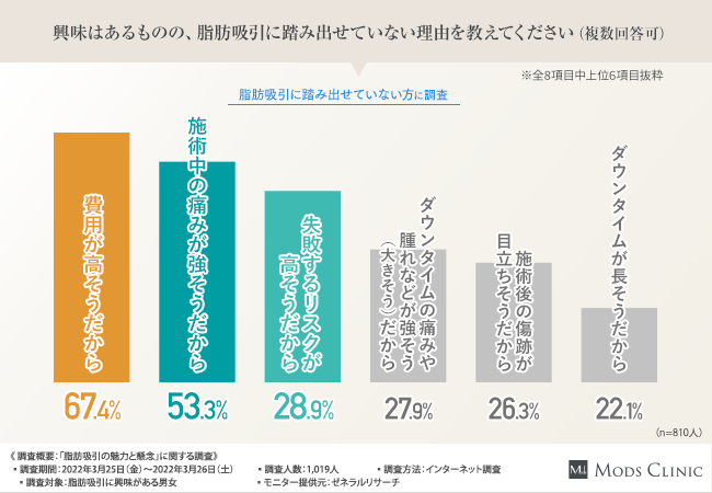 この結果は、痛みやダウンタイムなどのデメリットが先行しがちな「世間がイメージする脂肪吸引」に大きく関係がありそうです。