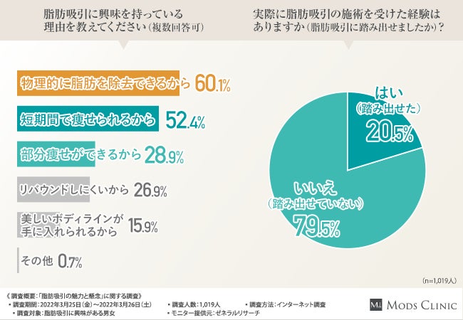 今回、脂肪吸引を専門とする美容外科『Mods Clinic(モッズクリニック)』(https://www.mods-clinic.com/)は、脂肪吸引に興味がある男女1,019人を対象に、「脂肪吸引の魅力と懸念」に関する調査を実施しました。