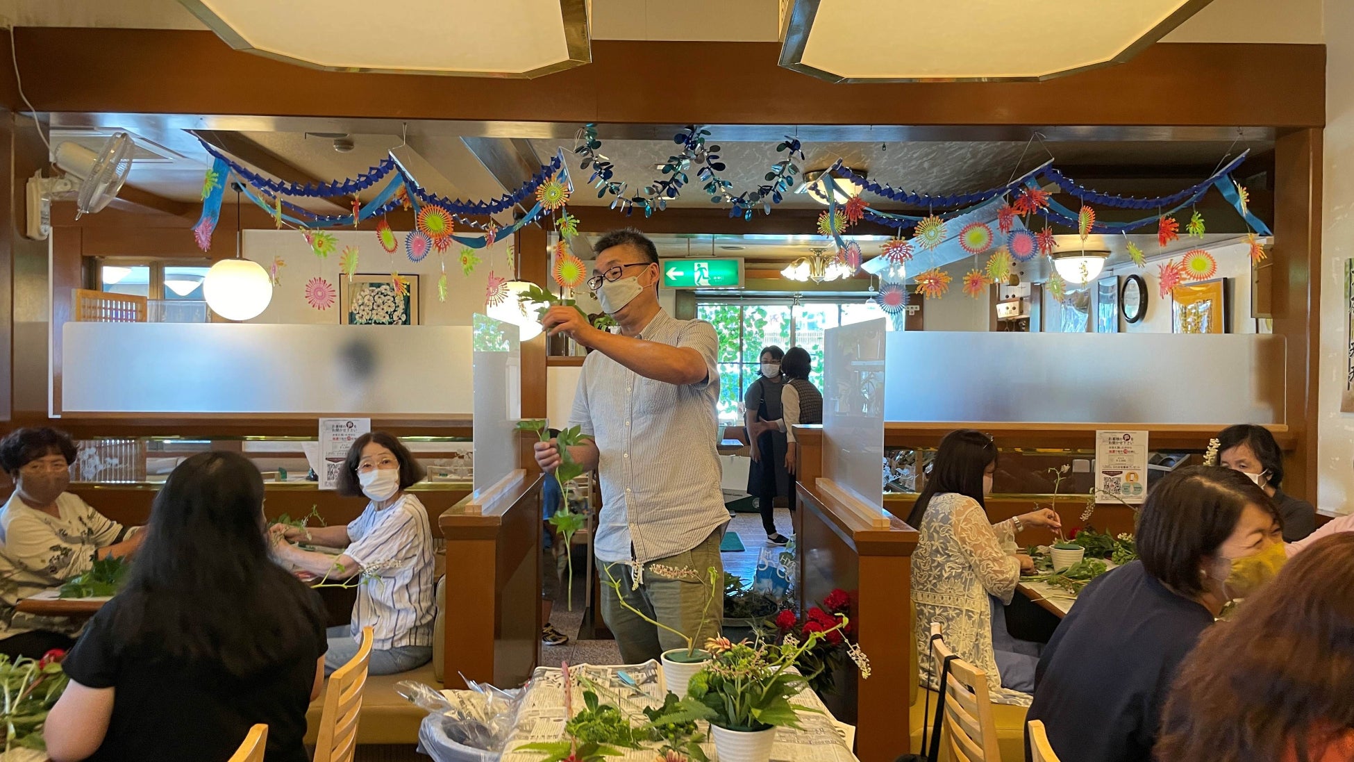 「みほり峠大内店」では、毎月1回「お食事付きのフラワーアレンジメント教室」を開催しています。講師は地元のフラワーショップの担当者。店舗のアイドルタイムを活用して、フラワーアレンジメントを楽しむほか、地元の参加者が親睦を図ります。