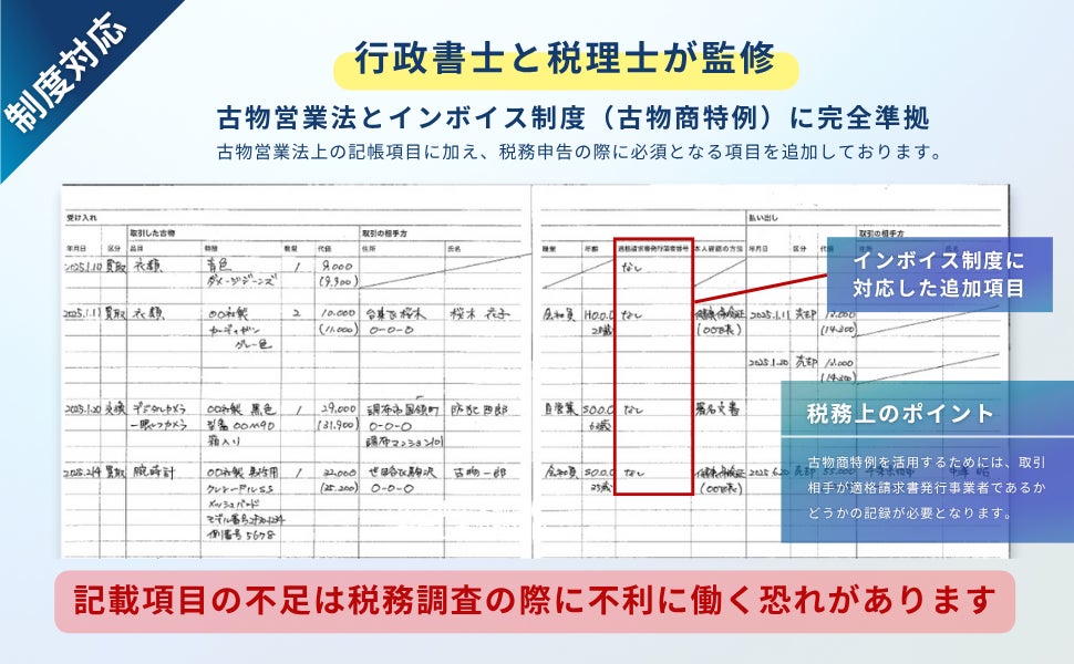 さらに、令和5年10月に改正された消費税法(インボイス制度)で、古物商の事業者は取引相手が「適格請求書発行事業者」であるかどうかを記録することが必要となりました。本商品は、税理士の監修を受けて、古物営業法だけではなく、インボイス制度に関する税務調査にも対応しやすいよう、帳簿項目を再設計しました。