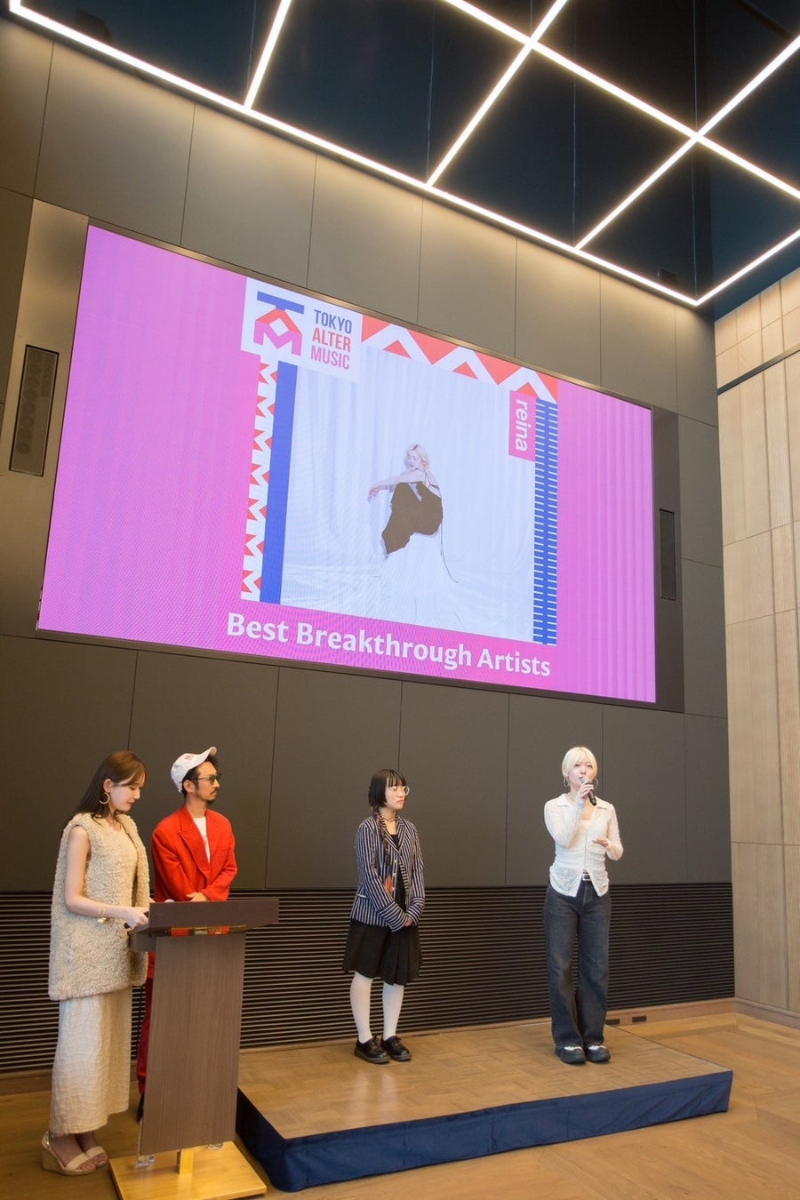 授賞式にはご招待した音楽関係者約70名が出席。TOKYO ALTER MUSIC AWARDのメンバーである高波由多加(Namy& Inc.)、モデル/ラジオパーソナリティの菅野結以さんが司会を務め、各受賞者からのメッセージビデオや音声コメントをお届けしたほか、直接会場にお越しいただいたWhyte ?te、北村蕗、reinaの3名にご登壇いただきました。