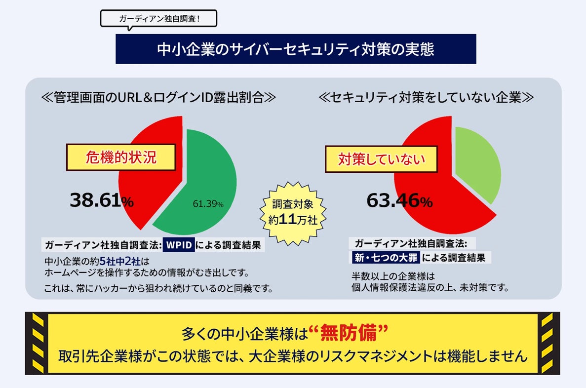 当社の独自調査によると、中小企業の約38.6%がホームページのログイン情報を露出した危険な状態にあり、63.4%がセキュリティ対策を一切実施していないという結果が出ています。(調査対象:約11万社)