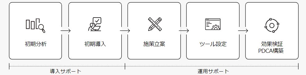 「KARTE導入・運用支援サービス」概要KARTEの初期導入から、施策立案・実装、効果検証などの運用までを、トータルサポートします。