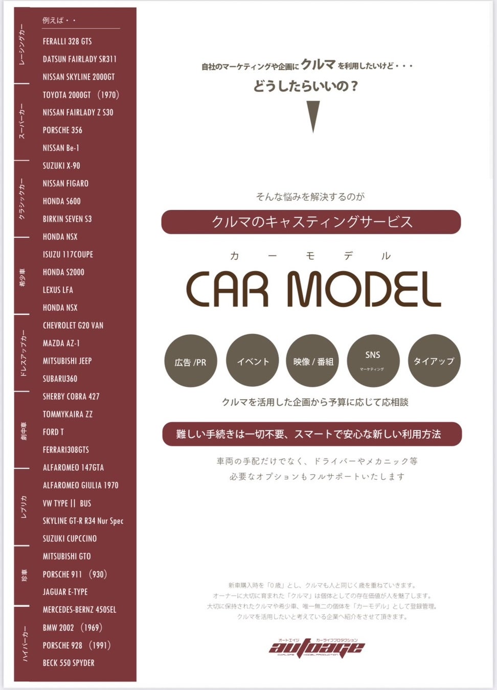 その中で、オートエイジでは一般企業から、車を扱う要望を受け、それに応じた車種のアテンドや現場管理等を行ってきた。例えばPRに車の写真を使いたい。古い時代のPVを作りたいから 歴史ある車を用意してほしい等々だ。