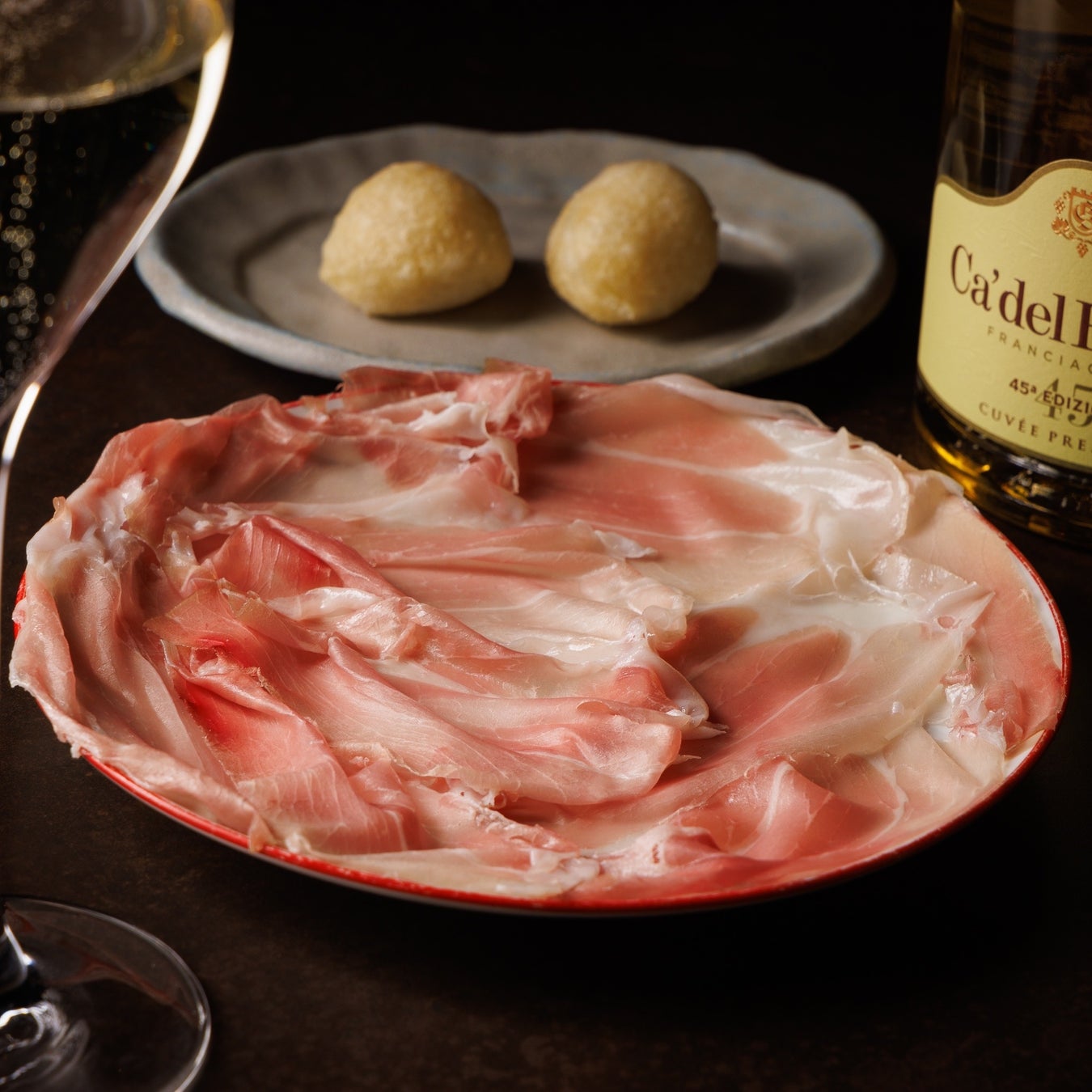 コースのスタート、まずは洋食堂葡萄の看板メニューで皆様ご注文頂ける、特別なスライサーで極薄にカットされた生ハム&ニョッコフリット。極薄の生ハムは熱々のニョッコフリットと共に食べると、生ハムの美味しい脂がとろけて幸せな気分になります。