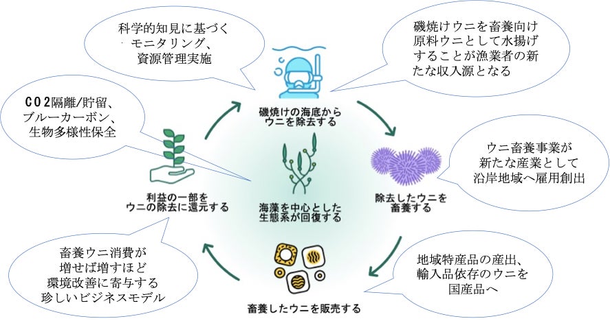 ウニノミクスグループは、世界の各拠点で磯焼け地域に生息する痩せて身入りの少ないウニを買い取り、独自のウニ陸上畜養技術と専用飼料で畜養し2か月ほどで商品として出荷することを可能としています。磯焼けの海で採取したウニを地域会社とともに畜養して販売することにより、藻場の回復による海洋生態系の回復、CO2吸収量増加による温暖化対策、地域経済の活性化、ウニの国内自給率の向上など多方面での社会貢献を目指しています。国内においては、大分県国東市と山口県長門市にてこの商業生産を行っており今後他所での展開予定があり、またカナダ、アメリカ、オセアニア、ノルウェーにおいても小規模試験を終え順次商業規模化を予定しています。