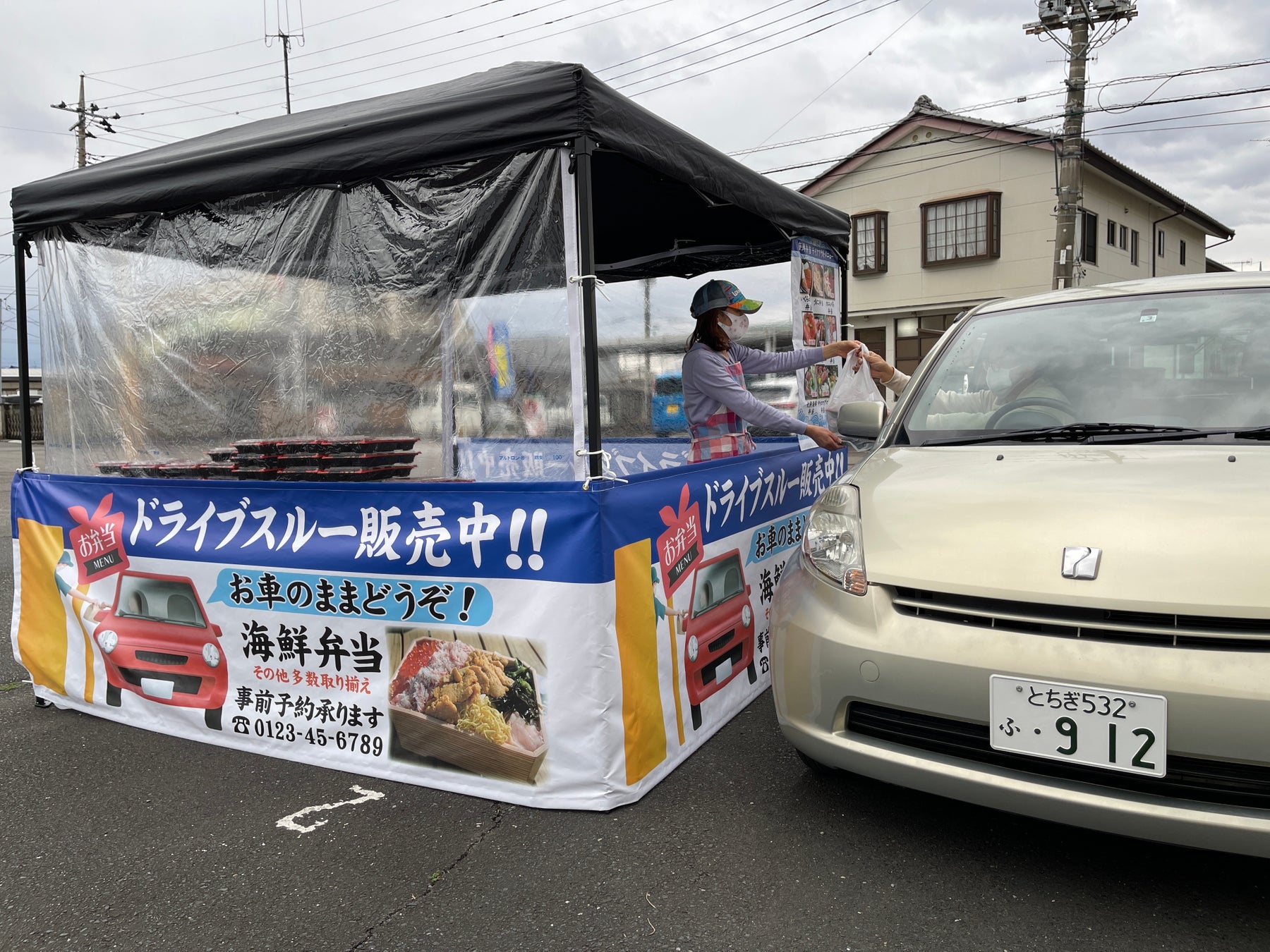 地方がこの流れに乗る為には ドライブスルーでのテイクアウト販売が必要です。簡単に設置できるドライブスルーコーナー(タープテント式)で 新たな販売チャネルを構築して下さい。