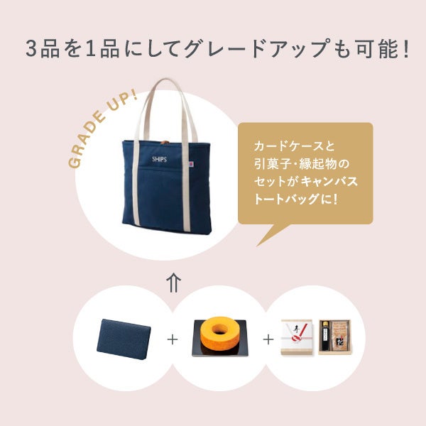 引菓子、縁起物を選ばずに、高価な引き出物を一つだけ選ぶことができ、通常引き出物の予算は3,000円ですが、引菓子、縁起物を合わせた予算分2,000円を加算して、合計5,000円の予算で商品が選べるので、ゲストはより高い満足度が感じられます。