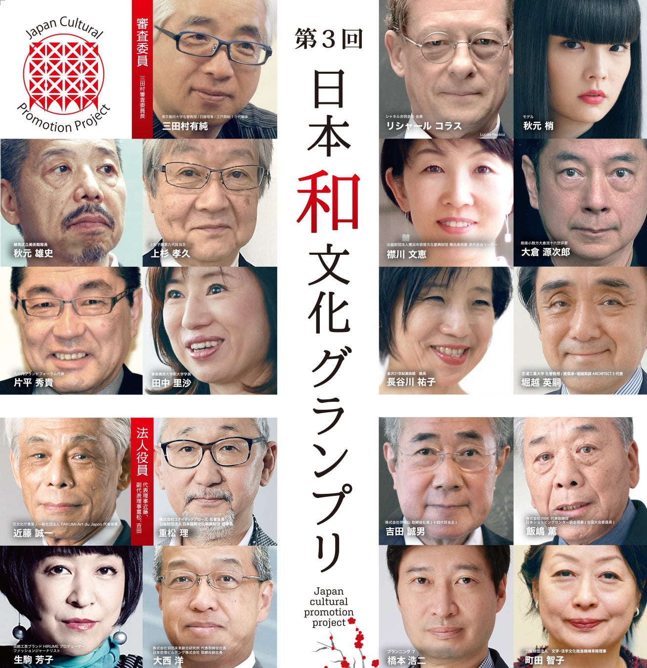 リシャールコラス シャネル合同会社 会長・秋元梢 モデル・秋元雄史 練馬区立美術館館長・上杉孝久 上杉子爵家九代目当主・襟川文恵 公益財団法人横浜市芸術文化振興財団 横浜美術館渉外担当リーダー・大倉源次郎 能楽小鼓方大倉流十六世宗家・片平秀貴 丸の内ブランドフォーラム代表・田中里沙 事業構想大学院大学学長・長谷川祐子 東京芸術大学国際芸術創造研究科教授 東京都現代美術館 参事・堀越英嗣 芝浦工業大学 名誉教授 建築家・堀越英嗣ARCHITECT 5 代表(審査員以下50音順)