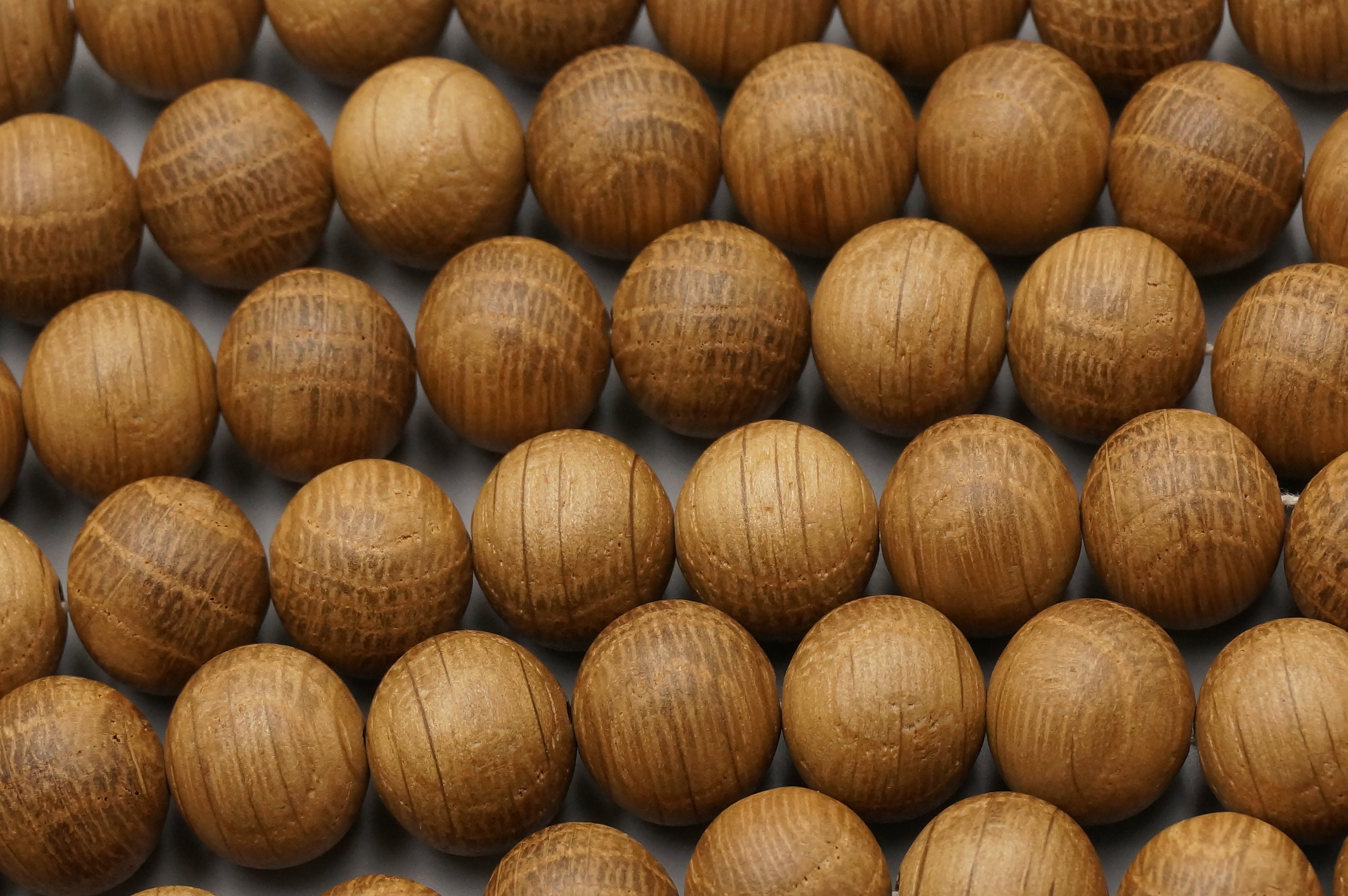 五⼗年にわたって、幾度となくウィスキーを熟成させた樽。樽の素材は「森の王」とも呼ばれるホワイトオークです。役割を終え解体された樽材から削り出した数珠⽟は、ホワイトオークならではの⽊⽬の美しさと独特の⾵合いがあります。表⾯の仕上げに特にこだわり、⽊本来の素材感を残しながら⻑年使⽤すると艶が出て、ウィスキーの熟成のように深みのある⾵合いに変化していきます。