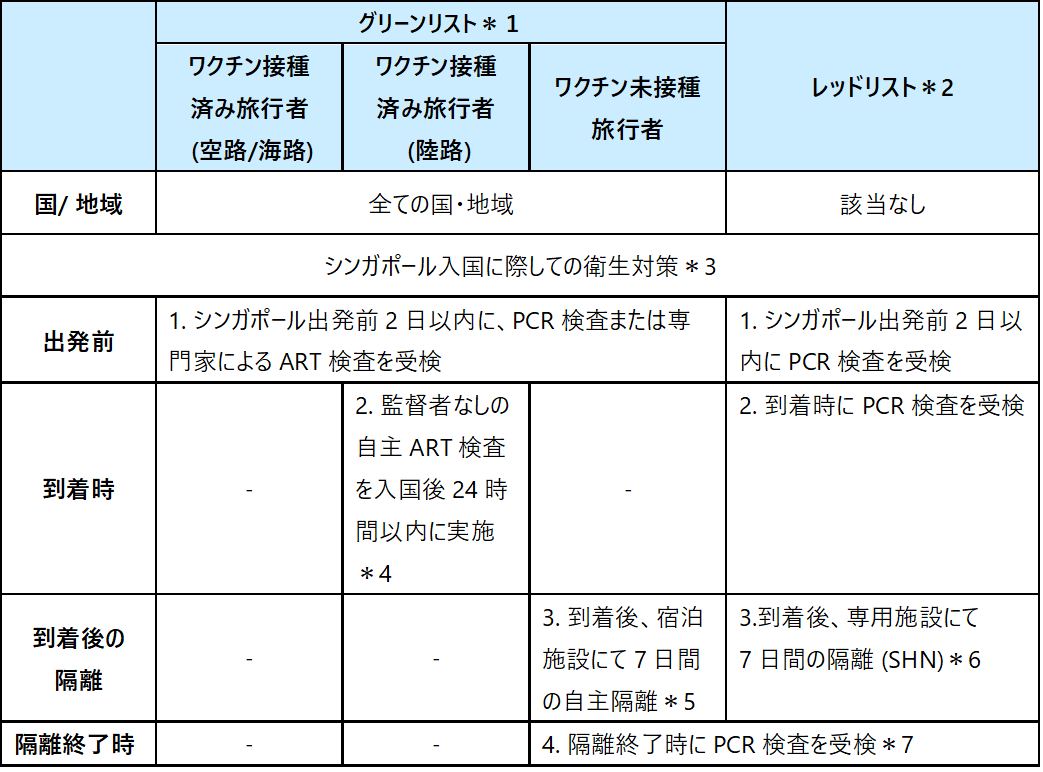 *3 上記の措置に加えて、上記とは異なる手続き、健康、予防接種の要件が課せられる場合があります。例:ワクチン未接種の短期パス保持者は入国許可の取得、労働省(MOM)発行の特定の長期パス保持者は追加の要件や措置の遵守など。詳しくは、セーフトラベルのウェブサイトをご確認ください。