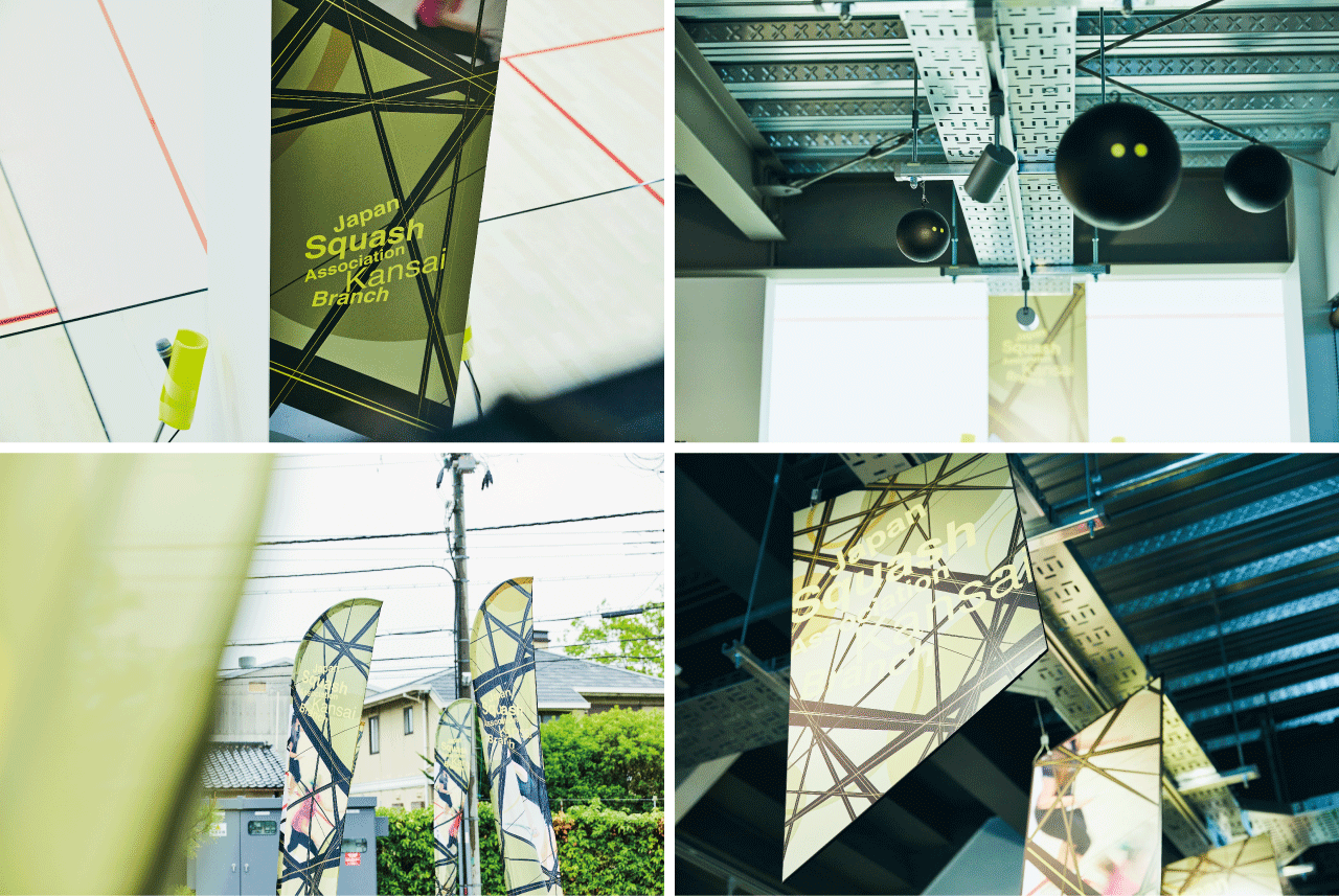 本大会の主催である日本スカッシュ協会関西支部様のブランディングの一貫としてVI(Visual Identity)を制作し、大会を盛り上げるための会場装飾を行いました。