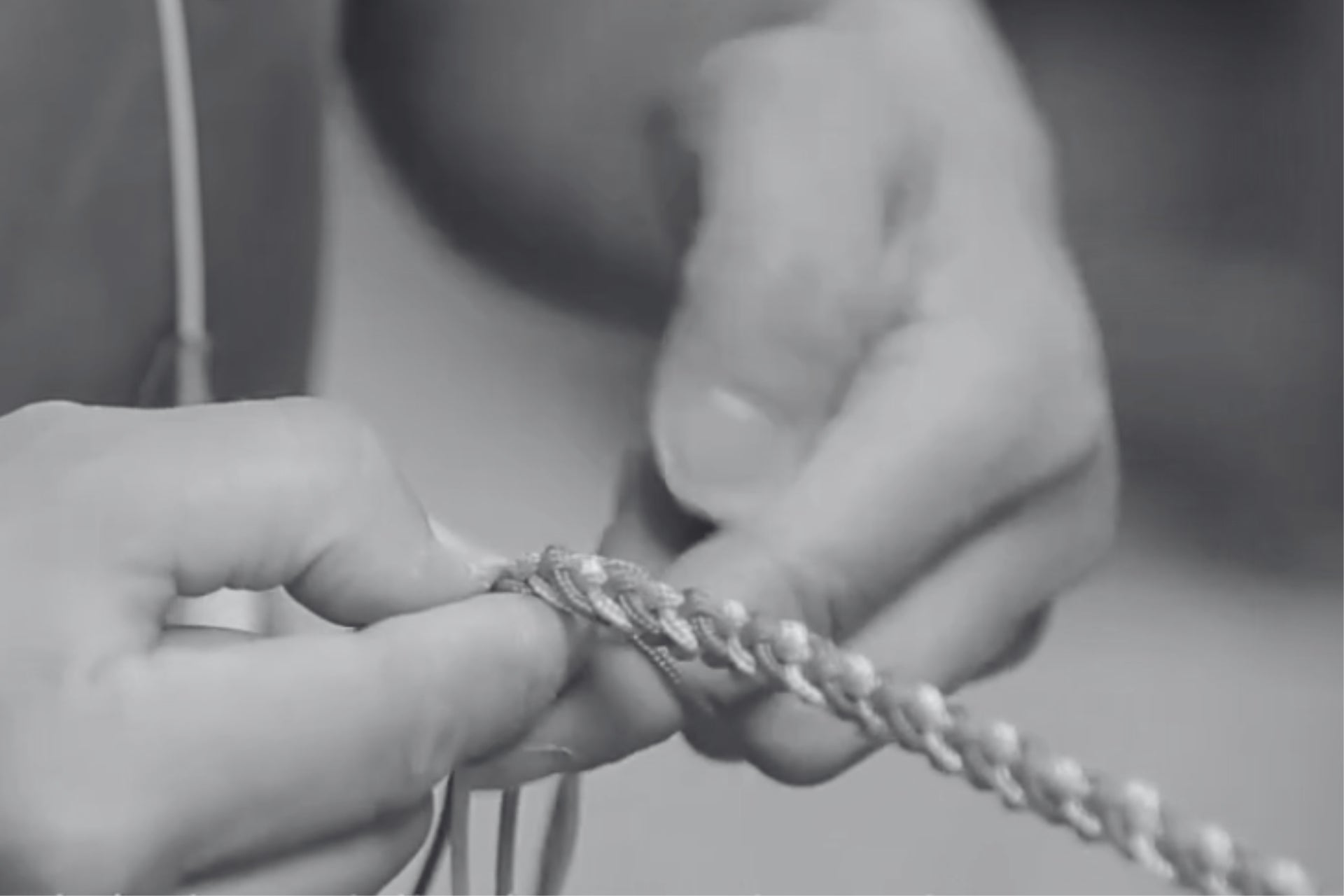 パラコードの素材感を活かしながら、さまざまな編み方をミックス。ほどよいボリュームとしなやかさで、手首に優しく馴染みます。