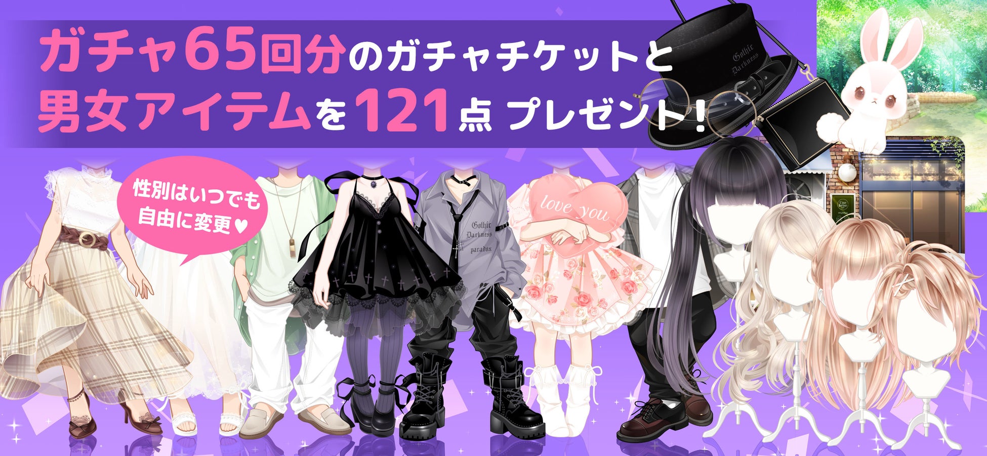 今アプリを始めるお客様には、ガチャで利用できるボーナスガチャチケット65枚(ガチャ65回分)、さらに、きせかえや撮影に使うアイテム合計121点をプレゼント!