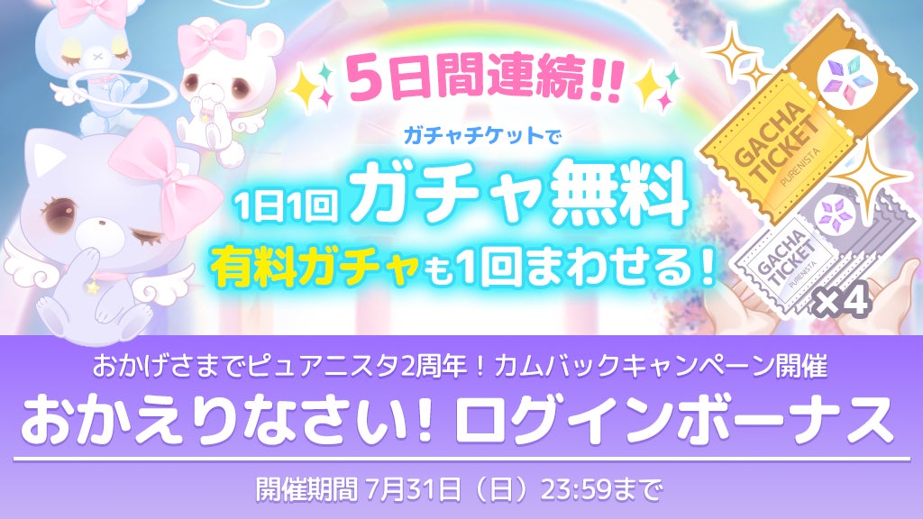 期間中、アプリを30日以上利用されていなかったお客様がアプリにログインすると、最大でボーナスガチャチケット4枚と、有料ガチャで使用できるガチャチケットを1枚受け取れるログインボーナスを実施中です。