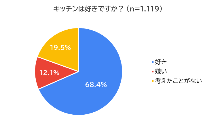 自宅のキッチンは好きか尋ねたところ、「好き」(68.4%)、「考えたことがない」(19.5%)、「嫌い」(12.1%)となりました。