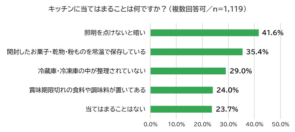 次の項目でキッチンに当てはまることは何か尋ねたところ、4割超が「照明を点けないと暗い」(41.6%)と回答。「開封したお菓子・乾物・粉ものを常温で保存している」(35.4%)、「冷蔵庫・冷凍庫の中が整理されていない」(29.0%)、「賞味期限切れの食材や調味料が置いてある」(24.0%)と続きました。