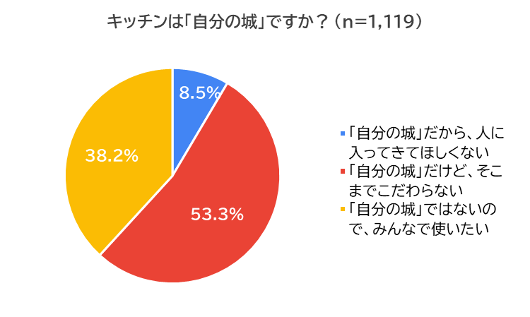 続いて、キッチンは「自分の城(聖域)」か尋ねました。「『自分の城』だけど、そこまでこだわらない」(53.3%)が最多となり、「『自分の城』だから、人に入ってきてほしくない」(8.5%)と回答した人は僅かでした。