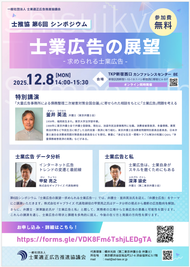 士業の広告に関する環境は日々変化しており、適正かつ効果的な広告の在り方が問われています。第6回となる本シンポジウムでは、「求められる士業広告」をテーマに、弁護士・釜井英法氏による特別講演をはじめ、広告データの専門家・甲斐亮之氏による分析、さらに弁護士・深澤論史氏による実務者からの視点を交え、士業広告の現状や課題と今後の展望を多角的に考察します。