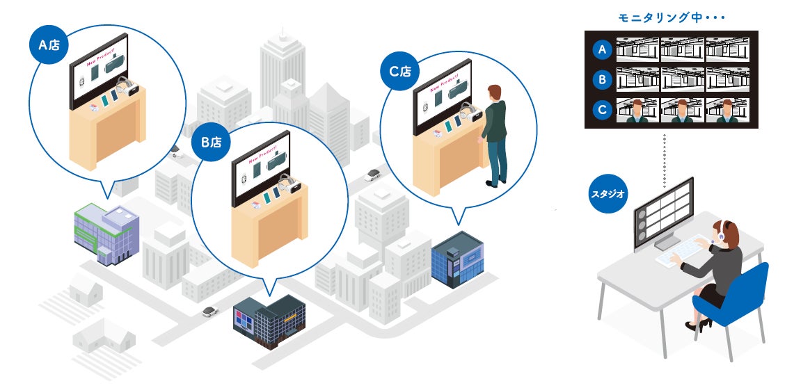 複数ヶ所を同時監視しながら、各拠点と遠隔接客(通話)ができ、スタジオや自宅からリモートワークで接客業務を可能にするビーツの自社開発サービスです。「えんかくさんリアル」を導入すると、オペレーター(受付・接客スタッフ)は自宅やスタジオに居ながらにして、店舗にいるお客様に対し遠隔で接客業務を行うことができます。「えんかくさんリアル」を利用した遠隔接客サービスには主に3つの特徴があります。