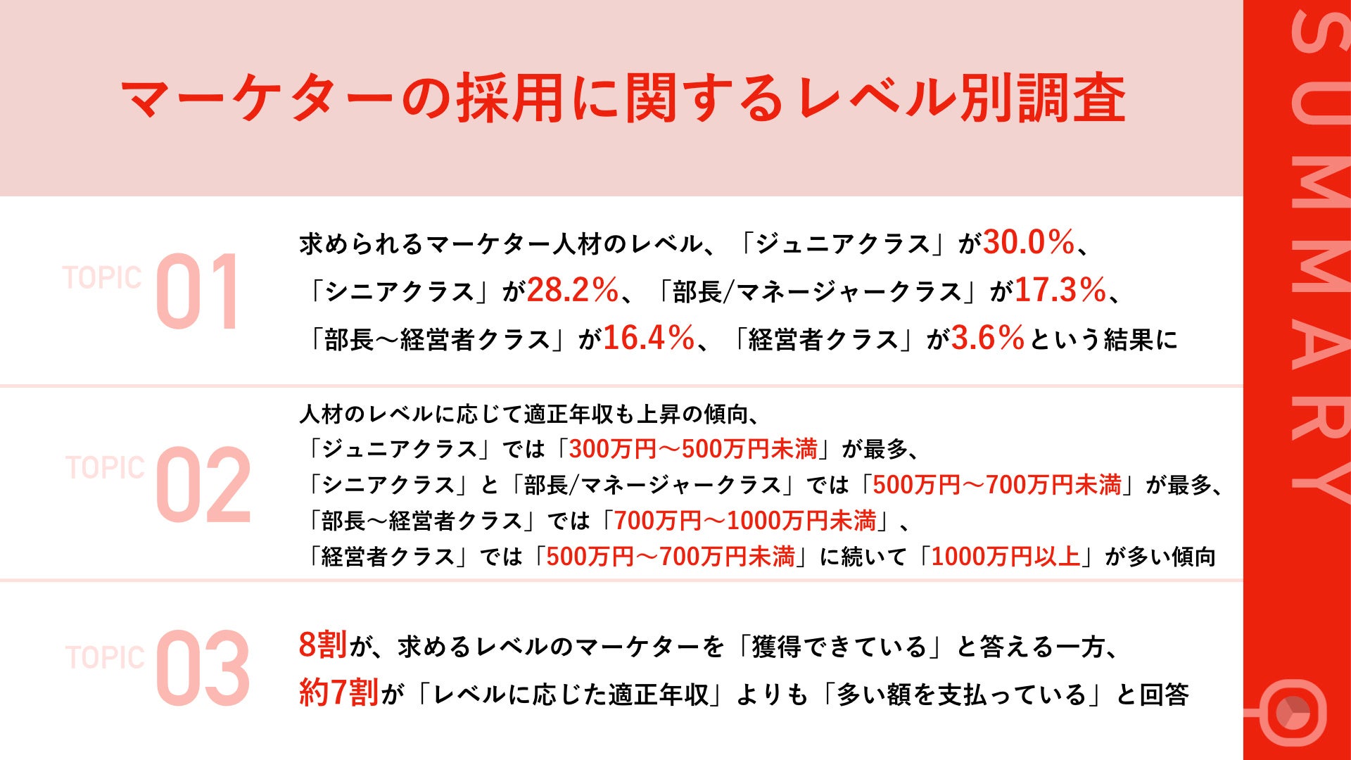 今回の調査では、現代のビジネスシーンにおいて、マーケターの役割がますます重要になっていることが明らかになりました。デジタルマーケティングの分野が急速に進化する中、適切な人材を確保することは企業の競争力を左右します。企業が求めるマーケターのスキルや経験は多岐にわたっており、マーケターの適正年収も多様化していると言えるのではないでしょうか。