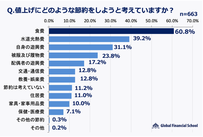 物価高への対策、増やすことより節約することが考えられる傾向。節約分は預金や投資へ。考えている節約は「食費」「水道光熱費」「自身の遊興費」「被服・履物費」。