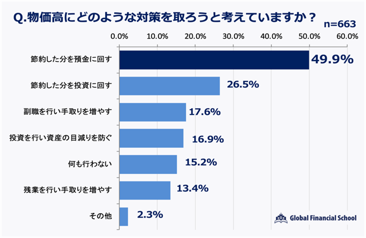 (49.9%)、次に多かったのは「節約した分を投資に回す」(26.5%)、「投資を行い資産の目減りを減らす」(17.6%)と合わせると44.1%となり、節約したお金を投資に回すことで物価高を乗り越えようとする傾向が高いことがわかりました。