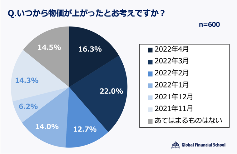 また「全く感じない」以外を回答した600人のうち、物価上昇がいつから始まったと感じているかを聞いたところ、2022年3月が最も多く22.0%。2022年以降に実感した人は合計65.0%となりました。