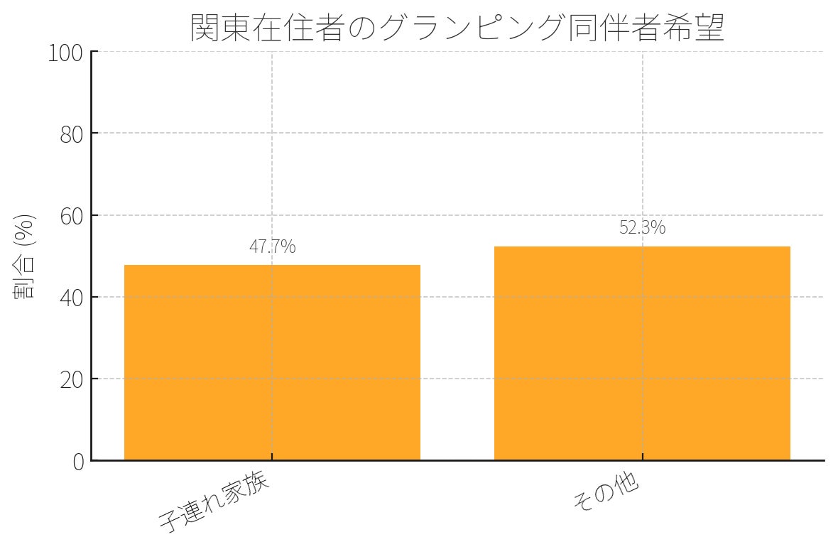 全国510人を対象にした調査において、「グランピングに行くとしたら、誰と行きたいですか?」という質問に対し、「子供連れ家族」と回答した方は全体の35.7%となりました。関東在住者に限ると、その割合は47.7%とさらに高くなります。