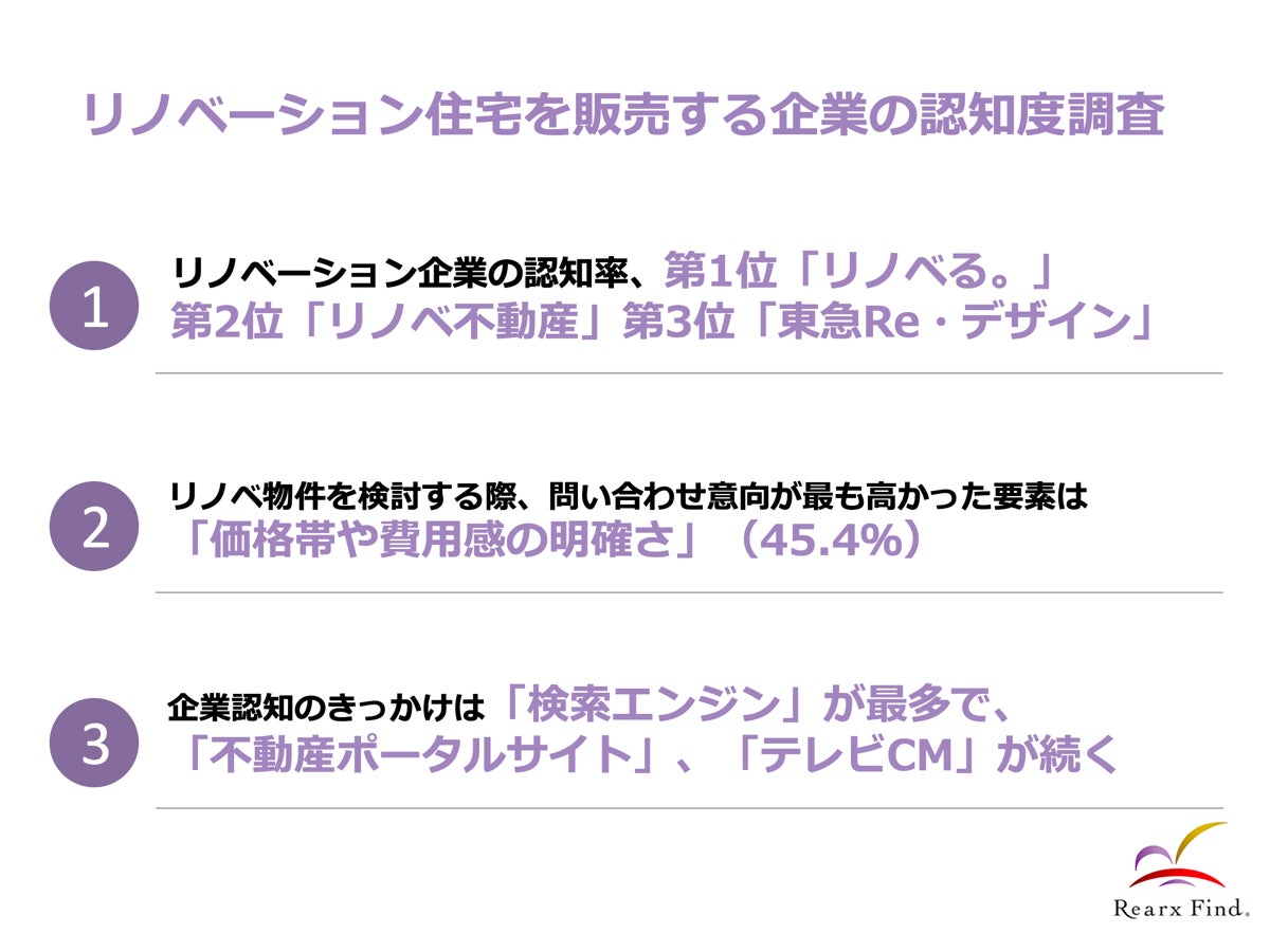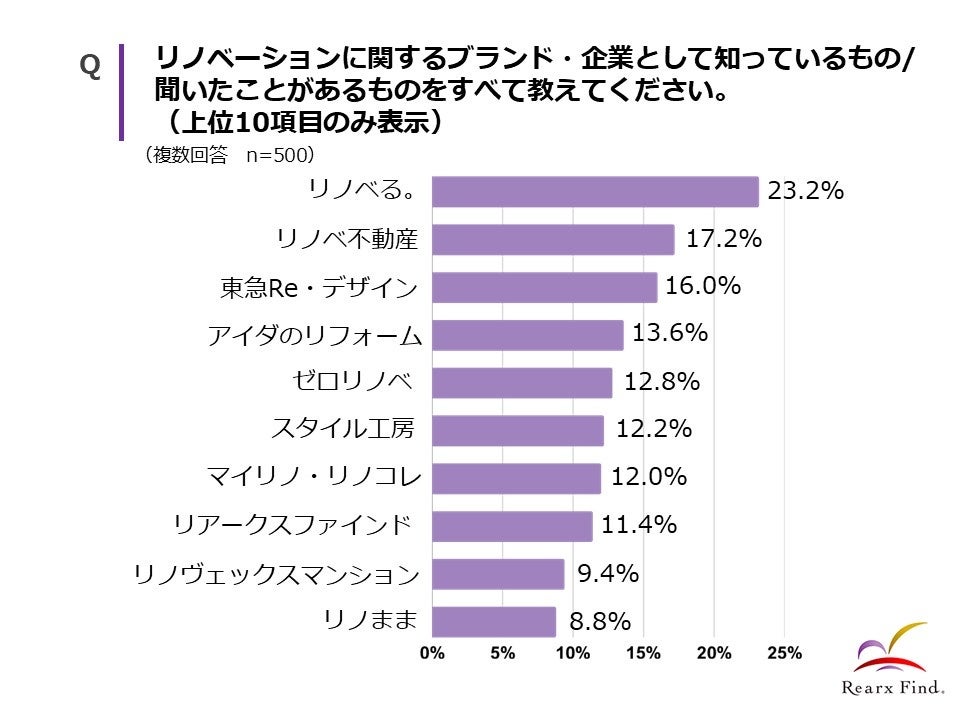 「人と不動産のかけ橋に」を企業理念とし、中古マンションの仕入れ営業・商品企画・販売営業を行う株式会社リアークスファインド(本社:東京都新宿区、代表取締役:大人慶太、以下「リアークスファインド」https://www.rearx-find.co.jp/ )は、住居用としてリノベーション済み中古物件の購入を検討したことがある一都三県在住の30代〜50代(世帯年収500万円以上)500人を対象に、リノベーション住宅を販売する企業の認知度調査を実施しましたので、お知らせいたします。