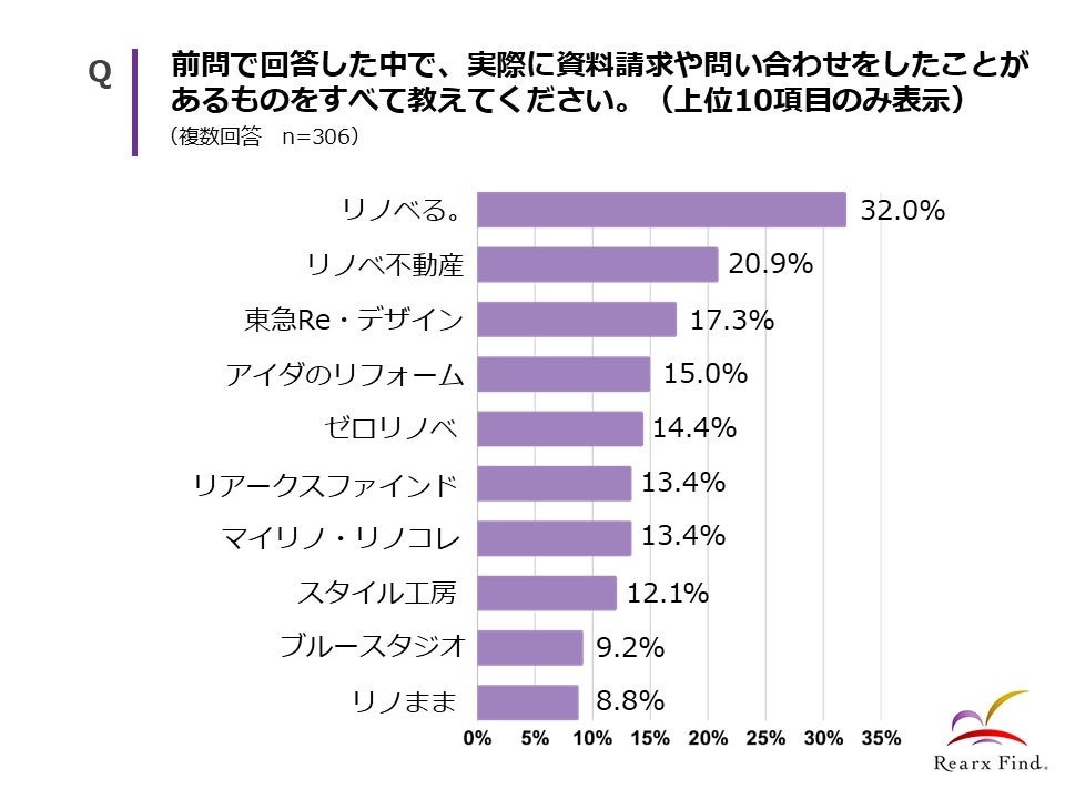 実際に資料請求や問い合わせをした経験についても「リノベる。」が32.0%で最多となりました。全体的に見ると、認知度の高い企業ほど問い合わせ経験も多く、基本的には認知と行動が比例する傾向があることがわかります。