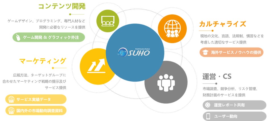 ゲーム開発、グラフィックなどの「コンテンツ開発」、ターゲットに合わせた広告の提案「マーケティング」、市場調査、競合分析、リスク管理などの「運営・CS」、海外展開に欠かせない現地の文化、言語、法規制などの反映「カルチャライズ」等のサービスを用意しており、実績のあるプロの技術を利用することで、新市場において早期に結果を出すことに貢献できるサービスとなっております。