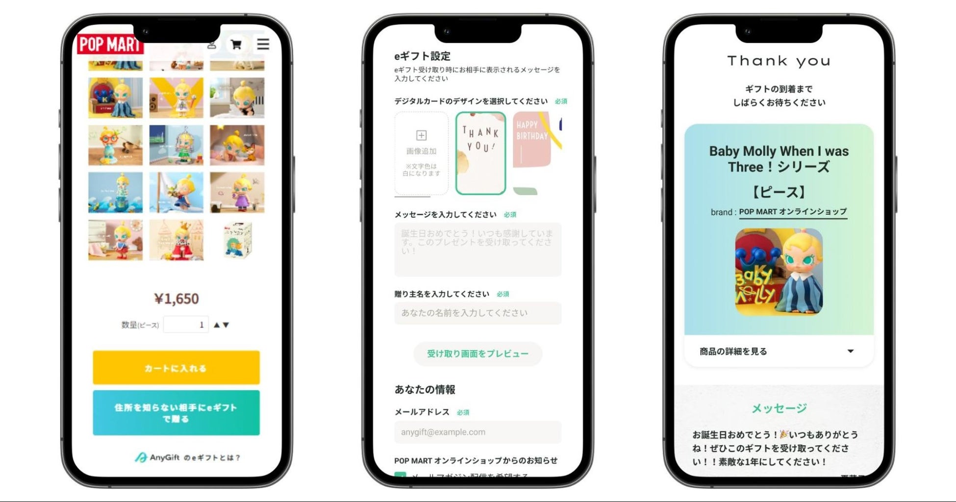 そこでこの度、お客様にもっと気軽にPOP MARTの商品をプレゼントとしてご利用いただきたいという思いから、AnyGiftの導入を決定いたしました。