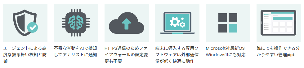 - パソコン上の不審な挙動を監視エージェントとセキュリティアナリストが24時間365日で監視を行い、脅威があると判断した時は防御まで実施します。