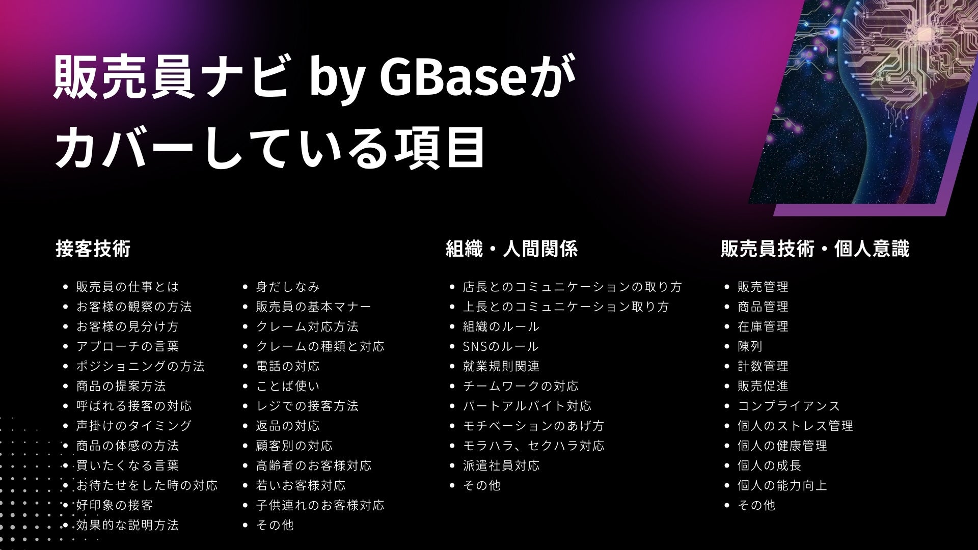 特に、長年にわたり流通業のコンサルティングを手がけており、業界に特化した教育・オペレーションに関する豊富なナレッジデータを保有しています。今回の「販売員ナビ by GBase」の開発にあたって、販売員の生産性向上に必要な「接客」「顧客対応」「クレーム対応」「レジ操作」「チーム運営」「コンプライアンス」「販売促進」「売上管理」「在庫管理」など、実務に直結する分野の知識を生成AIに学習させ、販売員が抱えるさまざまな悩みにチャットボットを通じて対応できる仕組みを構築しました。