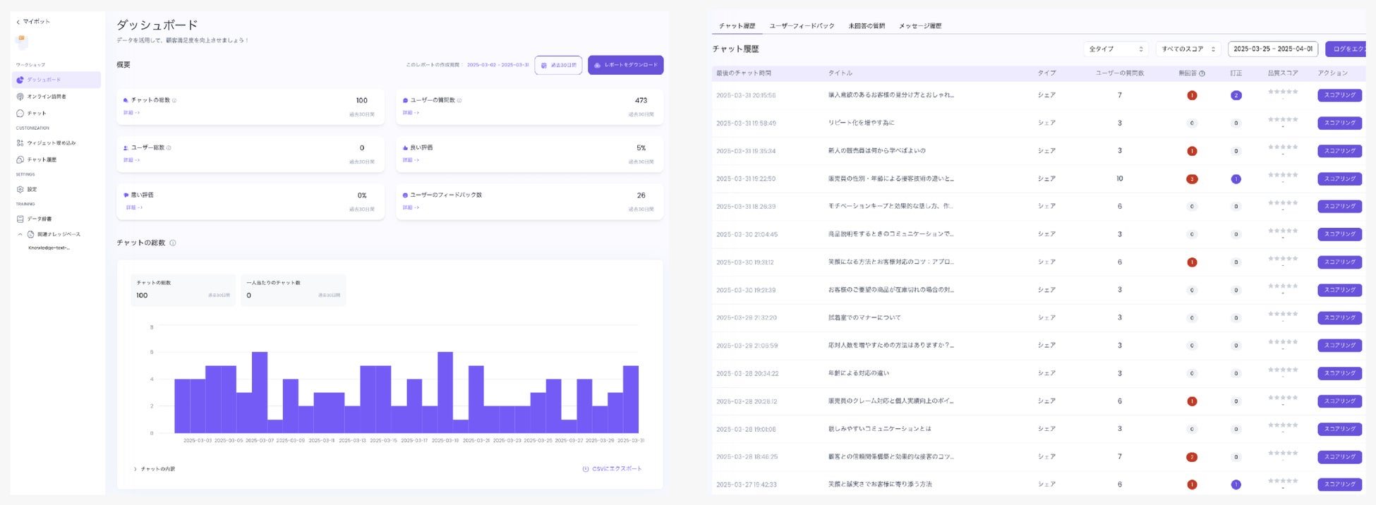 販売員からの質問を分析することで、現場の「見えない課題」を可視化。教育や研修内容の最適化に活かすことで、さらなる生産性向上につなげることができます。実際に導入企業からは「販売員の悩みが明確になり、悩み解決を店舗単位や企業単位で取り組むことで業績改善ができた」と評価いただいています。