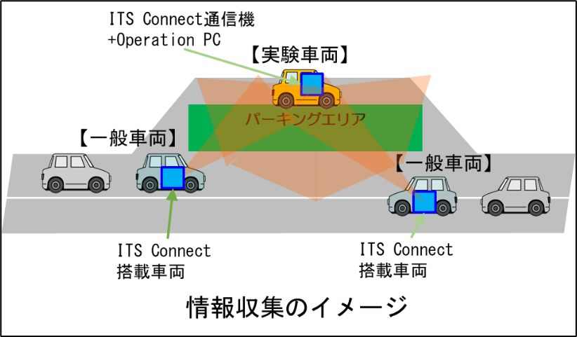 本実証実験は、ITS Connect受信機を搭載した実験車両を高速道路のパーキングエリアや高速道路近くの駐車場等に駐車し、高速道路上を走行するITS Connect搭載車両から送信されるデータを取得するというもので、首都高速道路や東名高速道路等 合計15か所で行われました。