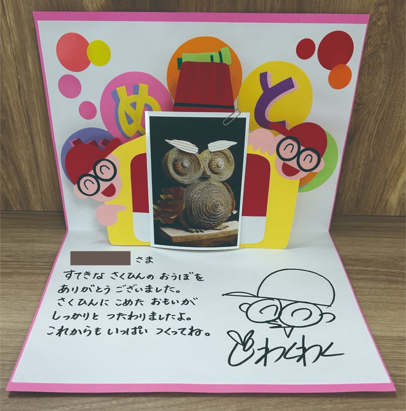 わくわくさんこと久保田雅人さんには、作品一点一点を審査いただきました。最優秀賞・優秀賞に選ばれた方には、手作りの賞状をご用意いただきました。