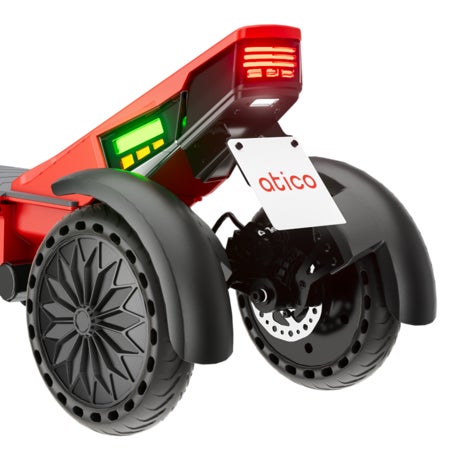 新製品「atico(あちこ)」は、一般的な3輪タイプとは異なり、後ろの2輪がそれぞれ独立して動くフリームーブ機構(特許出願中)を搭載しています。これにより、コーナリング時には2輪タイプと同様の軽快な乗り心地を実現し、停車時には足を地面に着くことなく、そのままの状態で停車することが可能です。コーナリング時の俊敏な操作感と停車時の3輪による安定性を両立しています。