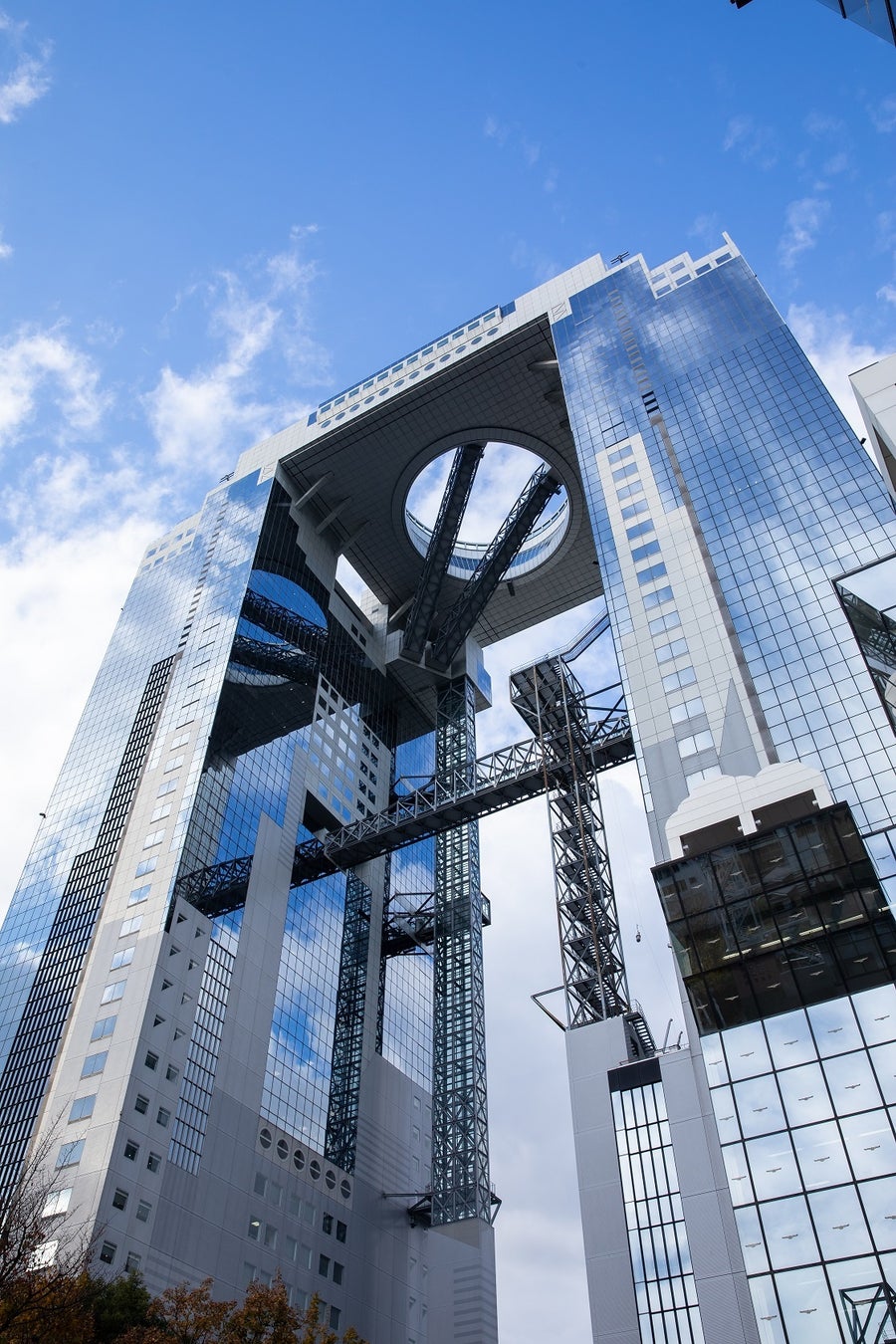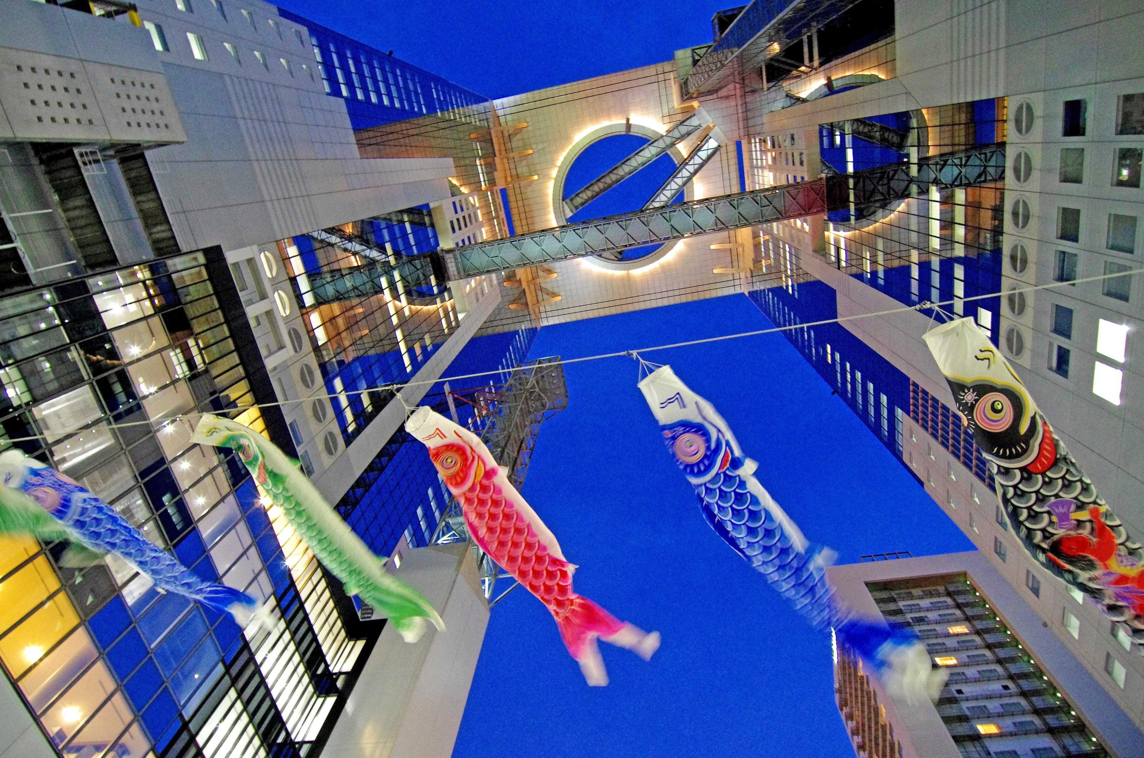 梅田スカイビルの谷間を泳ぐ鯉のぼり