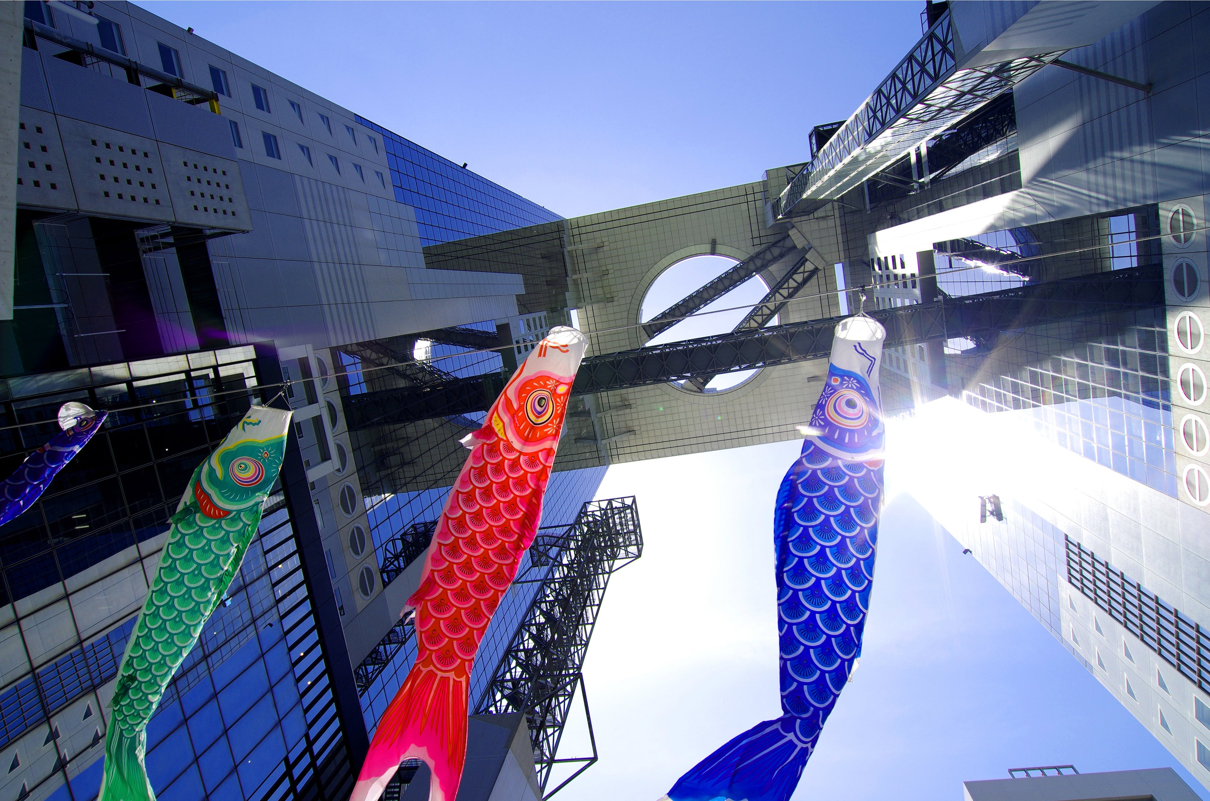 五月晴れの空の下、梅田スカイビルの巨大な吹き抜けを悠々と、また力強く泳ぐ鯉のぼりをお楽しみください。