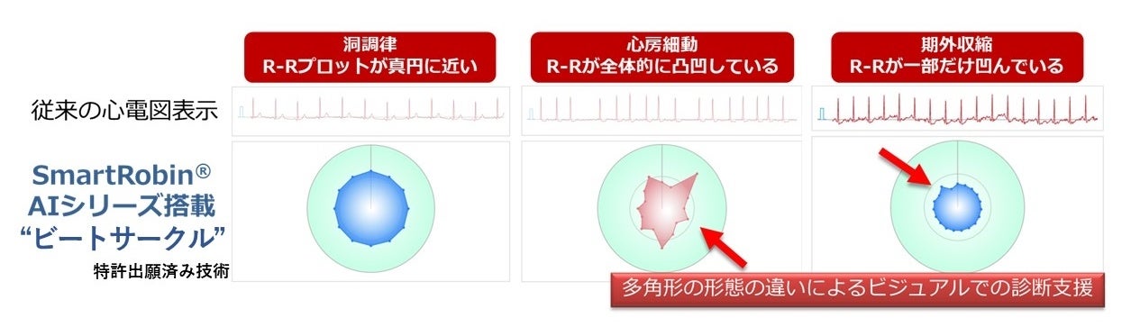 - 心房細動診断のための補助表示:AIを活用し、心房細動の特徴であるR-R間隔の不規則変動を同心円上に多角形表示することで心拍の変化を直感的に理解できる「ビートサークル」や、AIが心房細動診断に役立つ関心領域を提示する機能などの補助機能を搭載し、医師の診断を強くサポートします