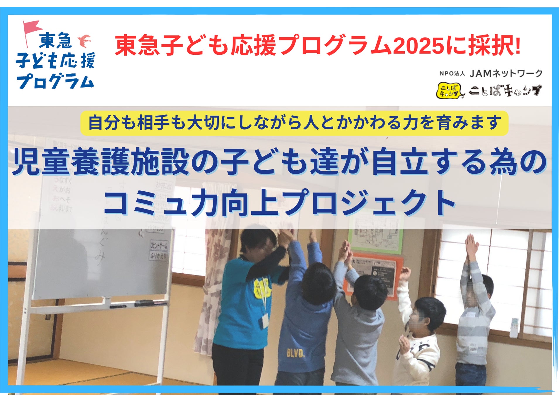 特定非営利活動法人JAMネットワーク(神奈川県横浜市、代表:村上好)が行う、児童養護施設の子どもたちの人生の可能性を広げるコミュニケーション力育成プログラム「ことばキャンプ®」が、2025年度 東急子ども応援プログラムの助成活動として採択されました。