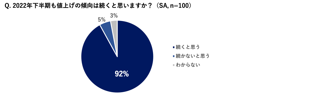 ・また、92%が2022年下半期も値上げの傾向は続くと回答。